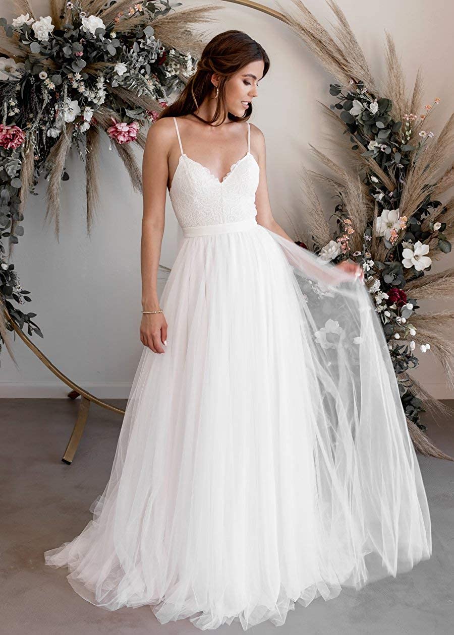Spaghetti Straps Wedding Dresses V-neck Lace Top Wedding Gown White Lace Tulle Wedding Dresses Long White Bridal Dress Wedding Dress with Train,GD004