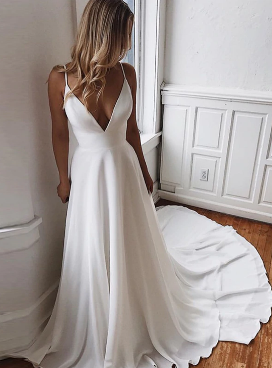 Spaghetti Straps White Wedding Dresses Elegant Satin Bridal Dresses Wedding Dress with Sweep Train Deep V-neck Sexy White Wedding Dresses,GD007