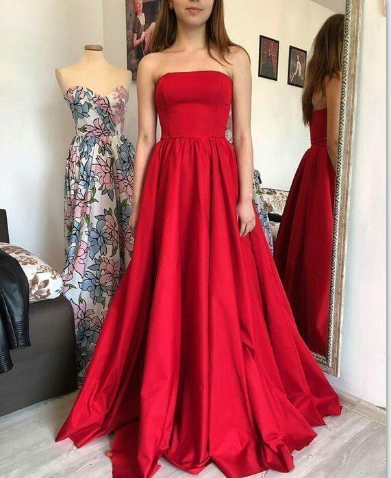 Red Satin Strapless Long Prom Dresses Womens Dresses Simple Floor Length Evening Dresses,GD052