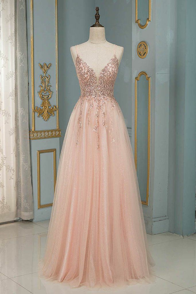 Spaghetti Straps V-neck Appliques Long Prom Dresses Sleeveless Pink Lace Evening Dresses Womens Dresses,GD060