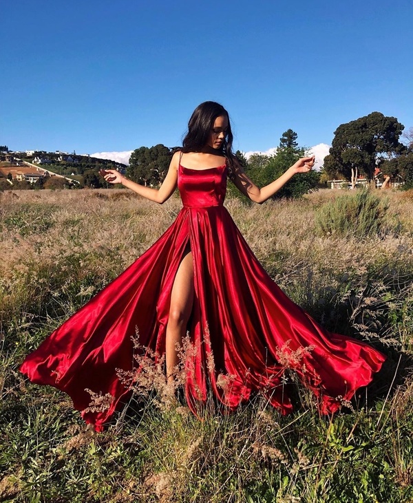 Spaghetti Straps Front Slit Prom Dresses Red Satin Long Evening Dresses Floor Length Womens Dresses,GD069