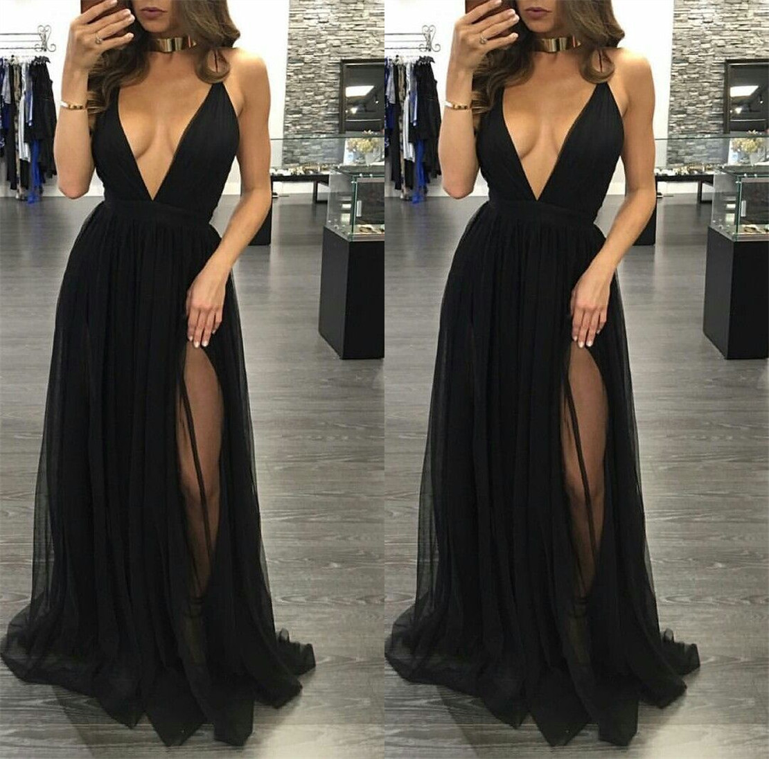 Deep V-neck Spaghetti Straps Prom Dresses Tulle Side Slit Sleeveless Womens Dresses Long Evening Dresses,GD071