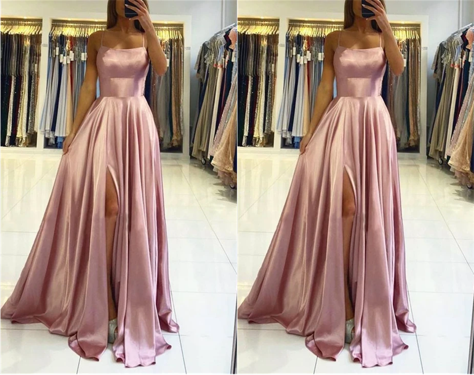 Spaghetti Straps Satin Long Prom Dresses Side Slit Sleeveless Womens Dresses Long Evening Dresses,GD085