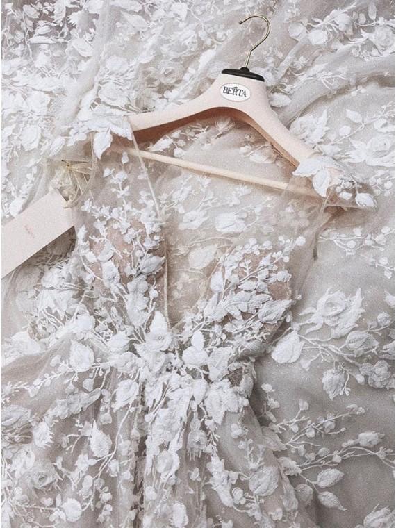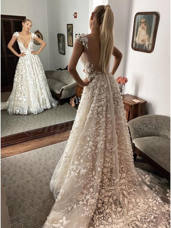 Stylish V Neck Tulle Cap Sleeves Appliques Long Prom Dress with Sweep Train,GD088