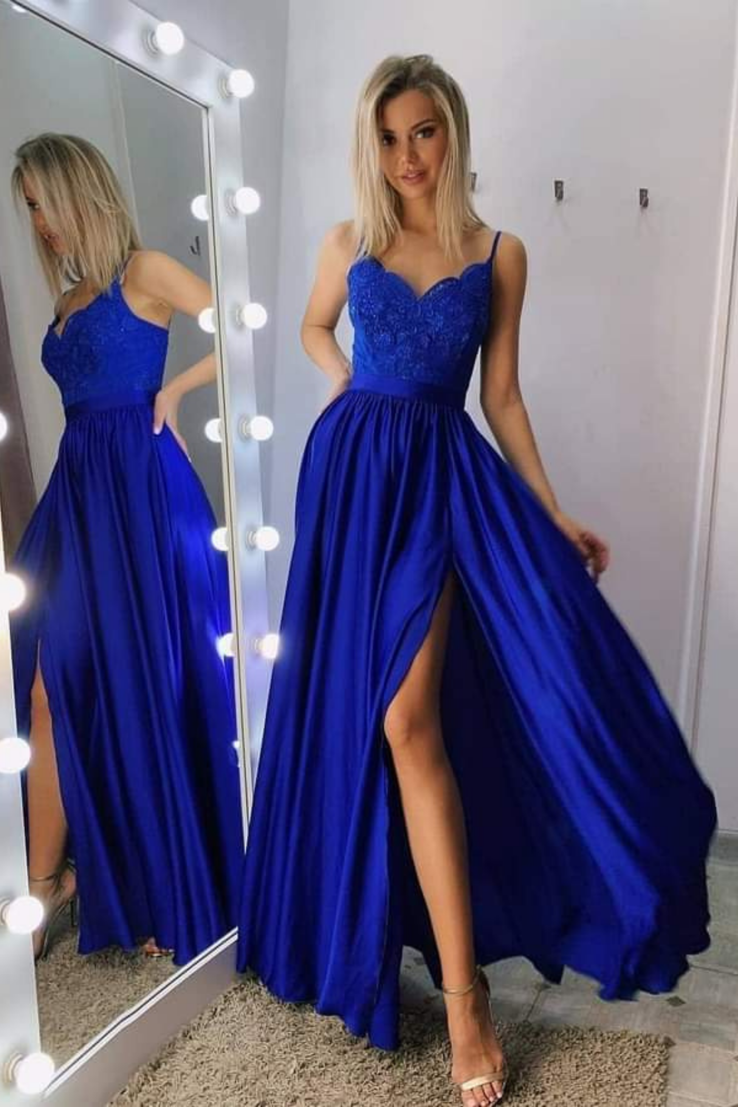 Spaghetti Straps V-neck Lace Top Prom Dresses Royal Blue Side Slit Evening Dresses Long Womens Dresses,GD091