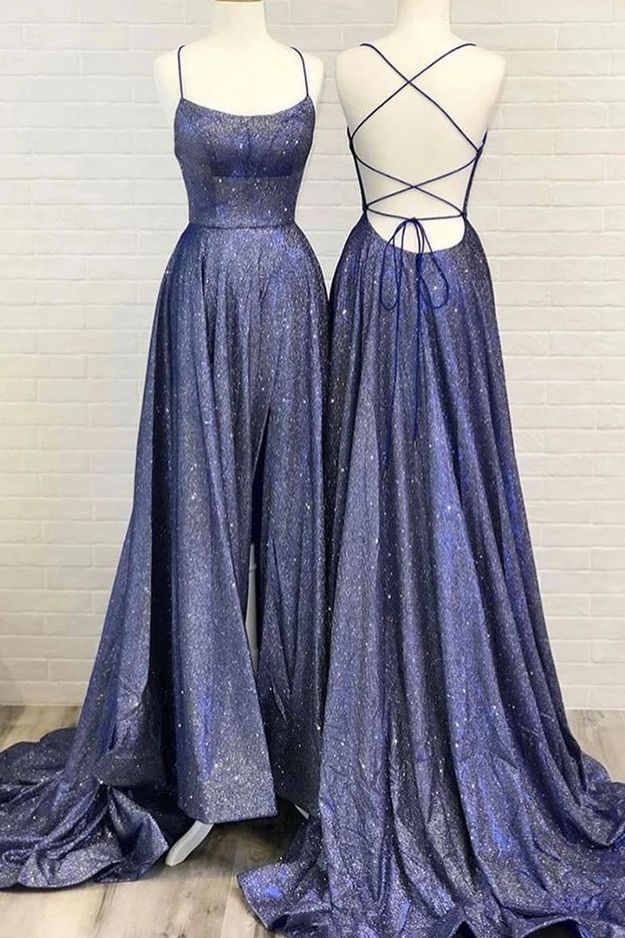 Open Back Spaghetti Straps Prom Dresses Backless Sparkle Slit Evening Dresses with Sweep Train Long Party Womens Dresses,GD092