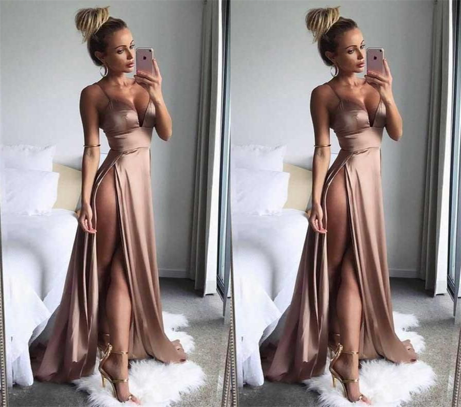 Sexy V-neck Satin Prom Dresses Slit Long Evening Party Dresses Evening Gown Womens Dresses,GD110