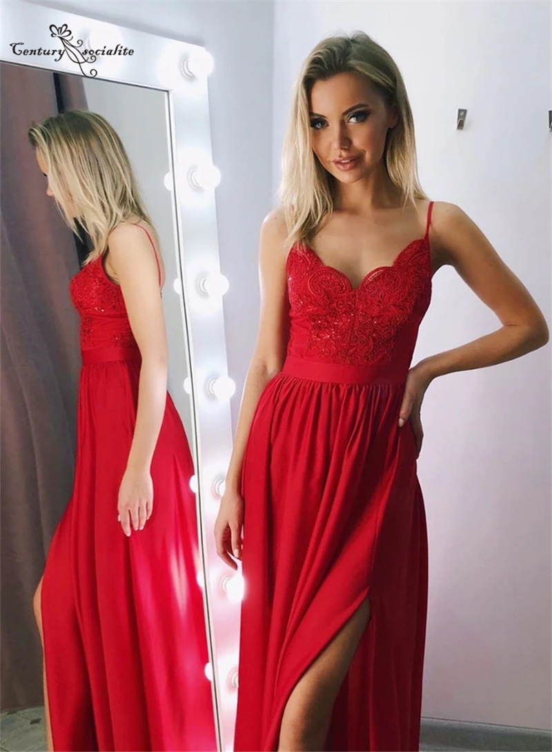 Spaghetti Straps V-neck Prom Dresses Red Lace Top Side Slit Evening Dresses Spaghetti Straps Womens Dresses,GD111