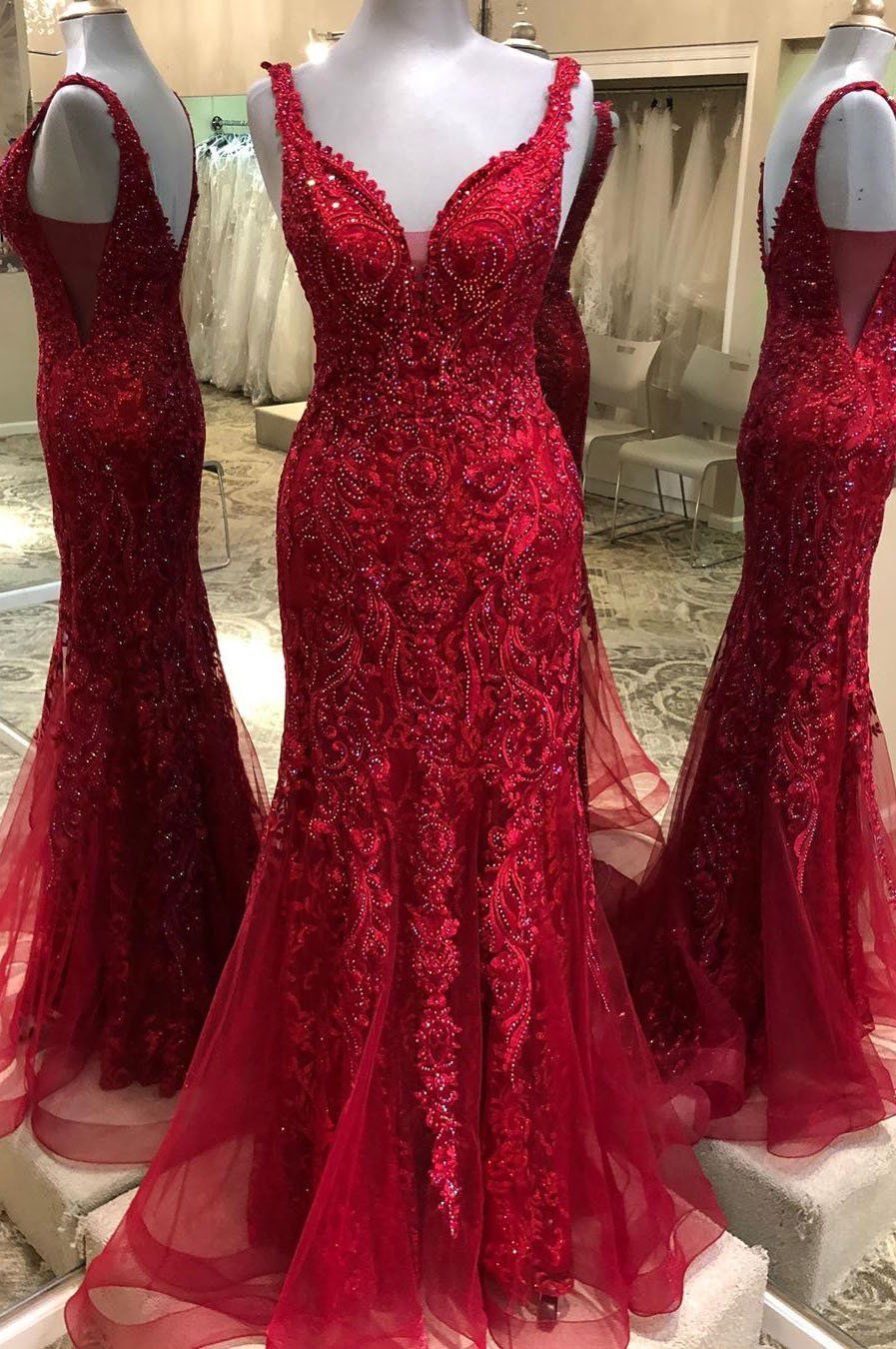 Burgundy Lace Prom Dresses V-neck Backless Evening Gown Mermaid Open Back Womens Dresses,GD117