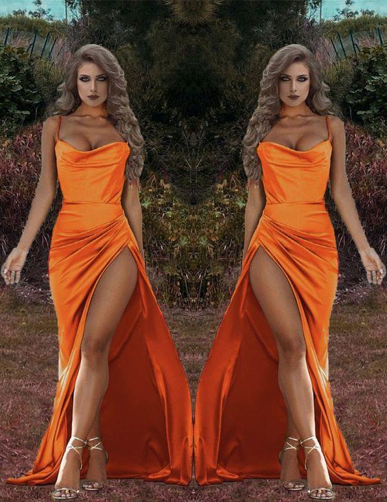 Spaghetti Straps Prom Dresses Orange Satin Bridesmaid Dresses Long Evening Dresses For Women,GD128