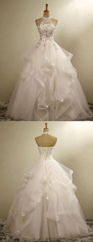 Halter O Neck A-line Wedding Gown White Tulle Bridal Dresses Floor Length White Prom Dresses,GD142