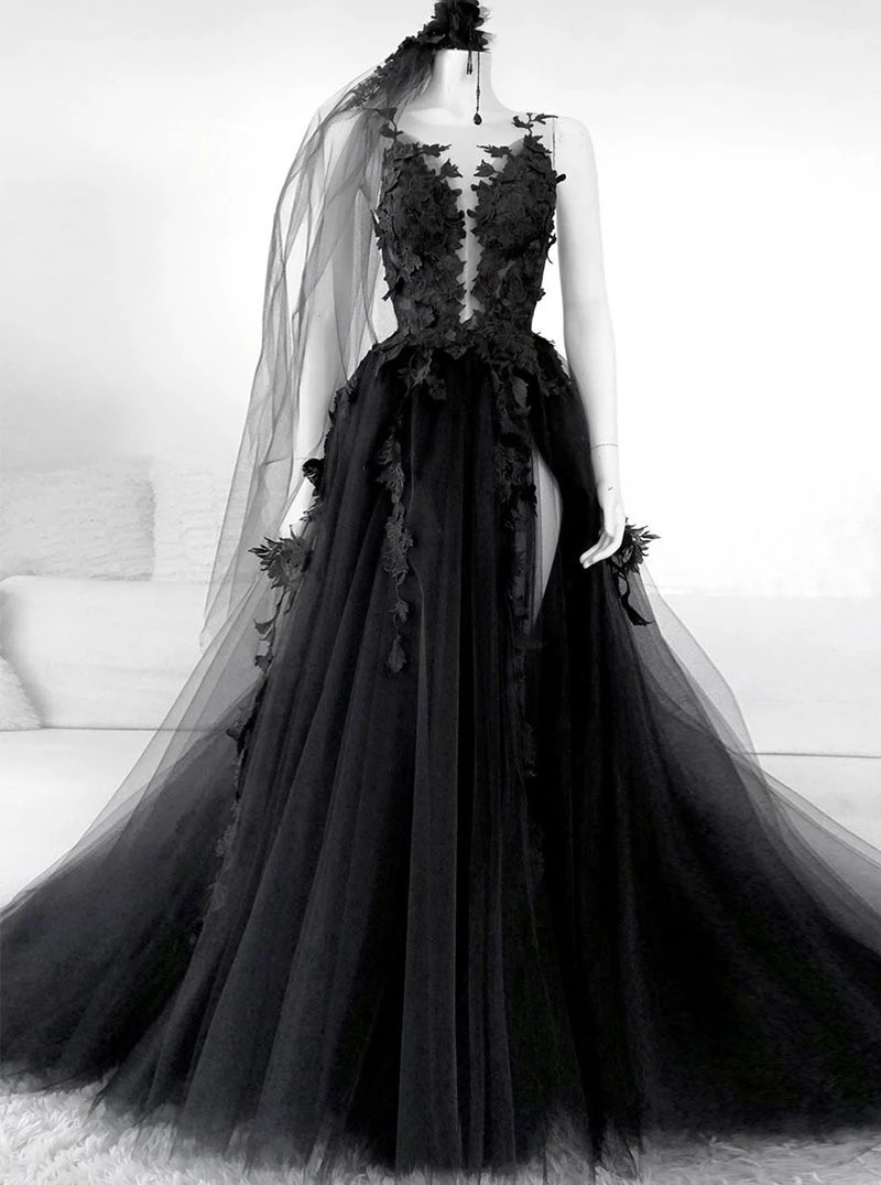 Tulle Round Black Long Prom Dresses Appliqued Backless Evening Dress,GD154