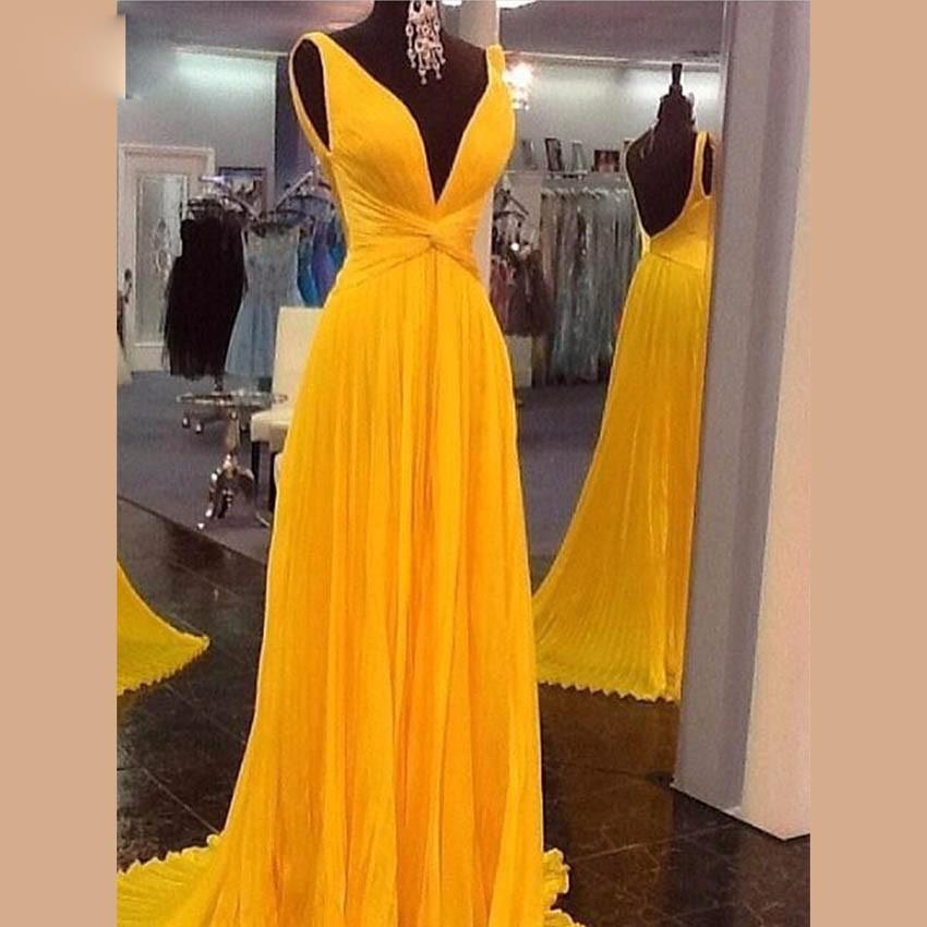 Deep V Neck Straps Long Evening Dresses Yellow Prom Dress Womens Dresses With Sweep Train,GD177