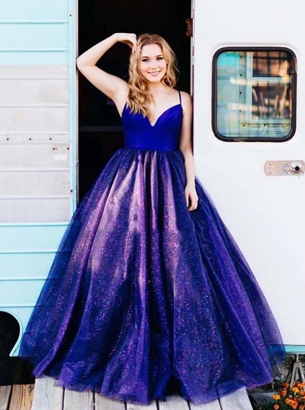 Sparkly Tulle A-line V-neck Long Royal Blue Sleeveless Prom Dresses,GD189