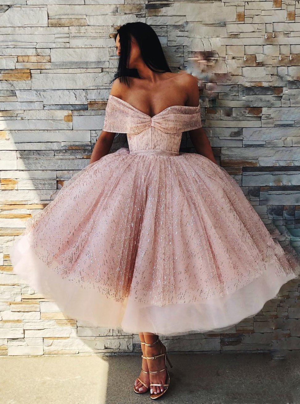 Princess Tea Length Prom Dresses Off-Shoulder Sparkly Homecoming Dress,GD194