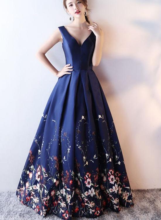 Navy Blue Satin And Floral Floor Length Party Gowns Women Prom Dresses Formal Gowns for Women,GD209