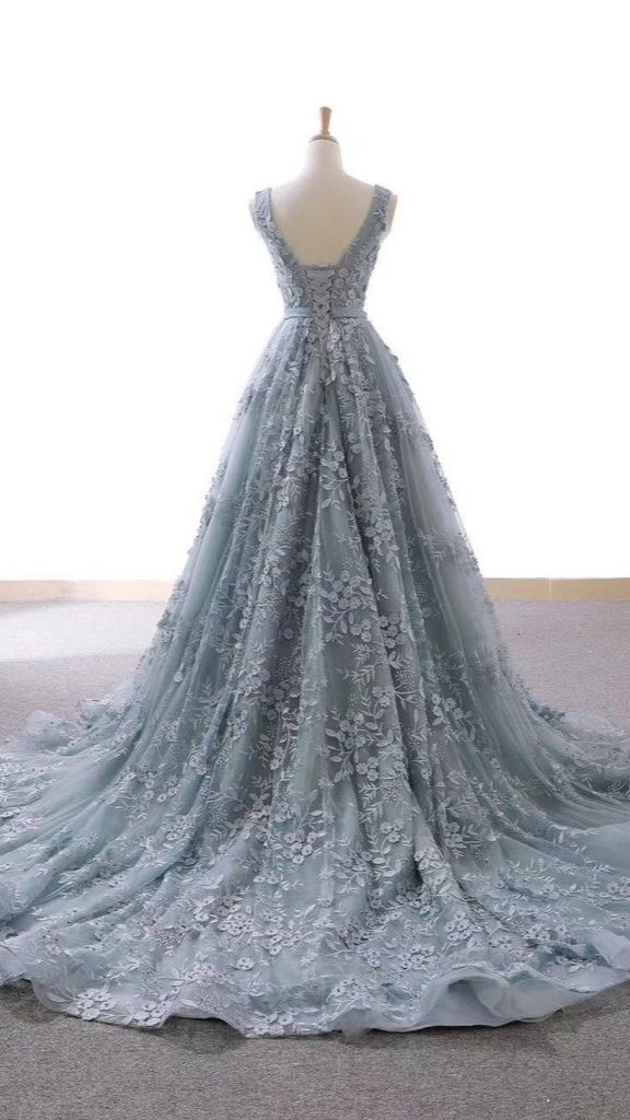 Dusty Blue Tulle Long Prom Dress With Appliques Formal Gown,GD219