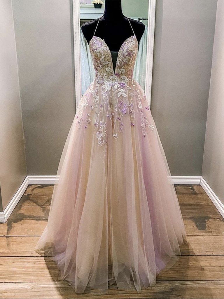 A Line V Neck Backless Pink Lace Floral Long Prom Dresses V Neck Pink Formal Dresses Pink Lace Evening Dresses,GD226