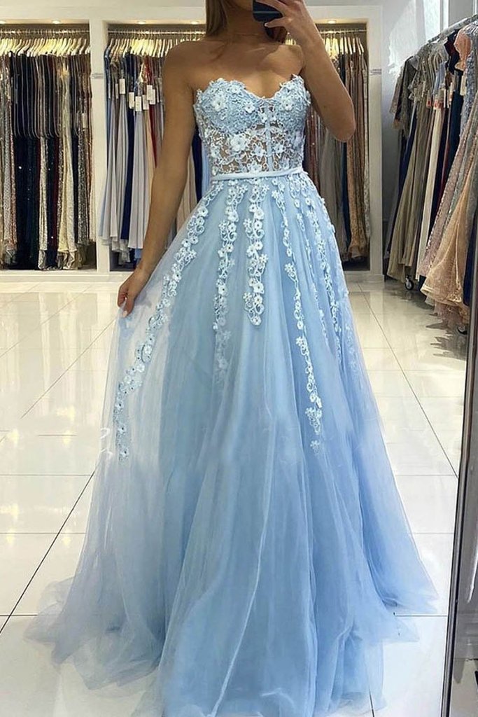 Sweetheart Lace Appliques Prom Dresses for Women Blue Tulle Evening Long Dress Party Dress,GD289
