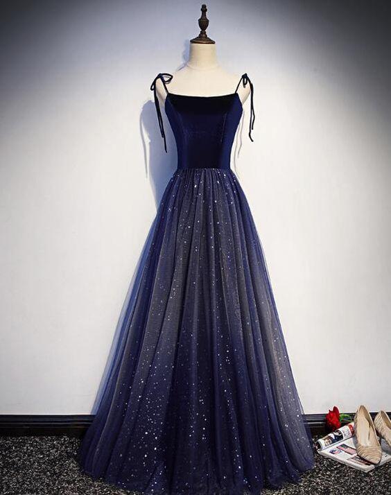 Navy Blue Velvet And Tulle Straps Party Dress, Charming Formal Gown,GD456