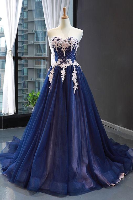Gorgeous Prom Dresses Sweetheart Navy Blue Evening Long Dresses Lace Appliques Womens Dresses,GD472