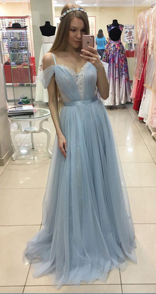 Spaghetti Straps A-line Tulle Prom Dress Long Blue Women Evening Dress,GD486