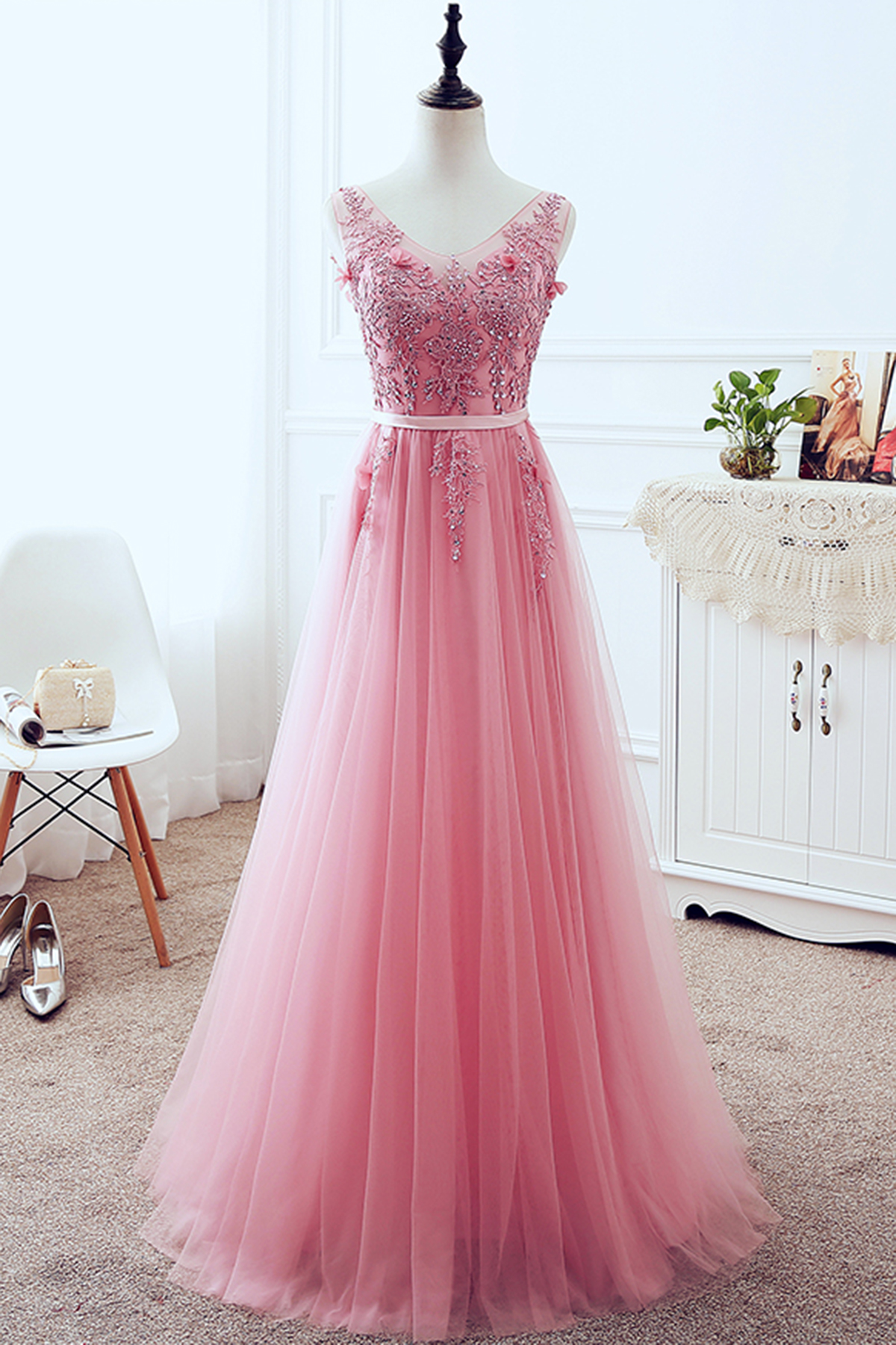 Pink Tulle Prom Dresses Tulle Evening Gown Dress Prom Beaded Lace Appliques Women Dresses,GH540